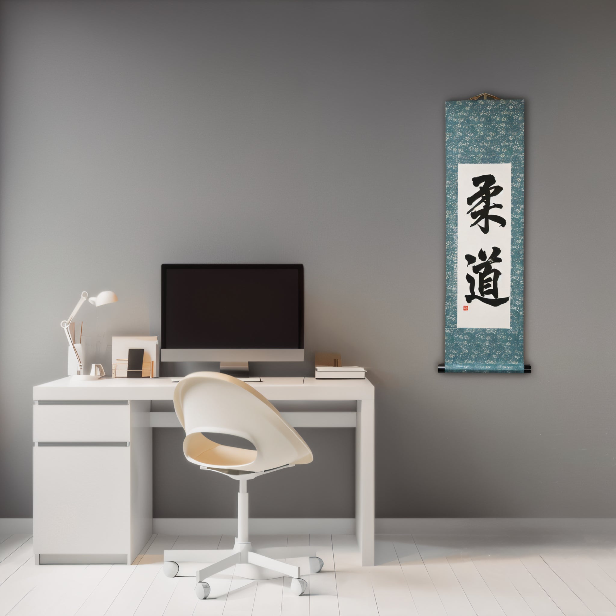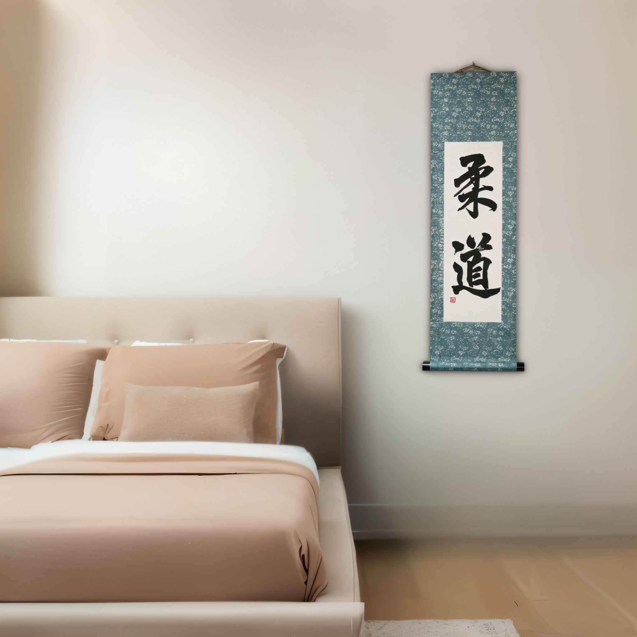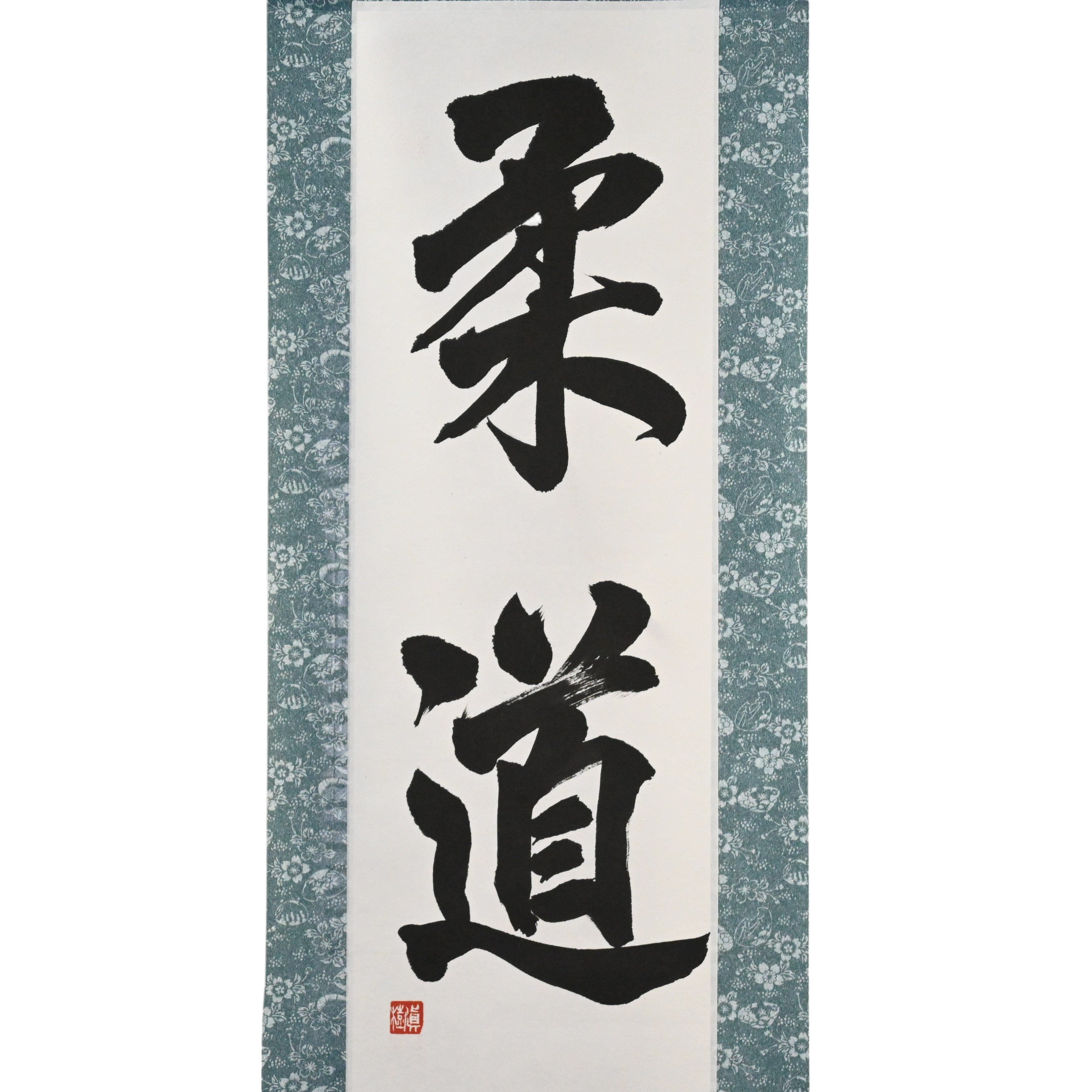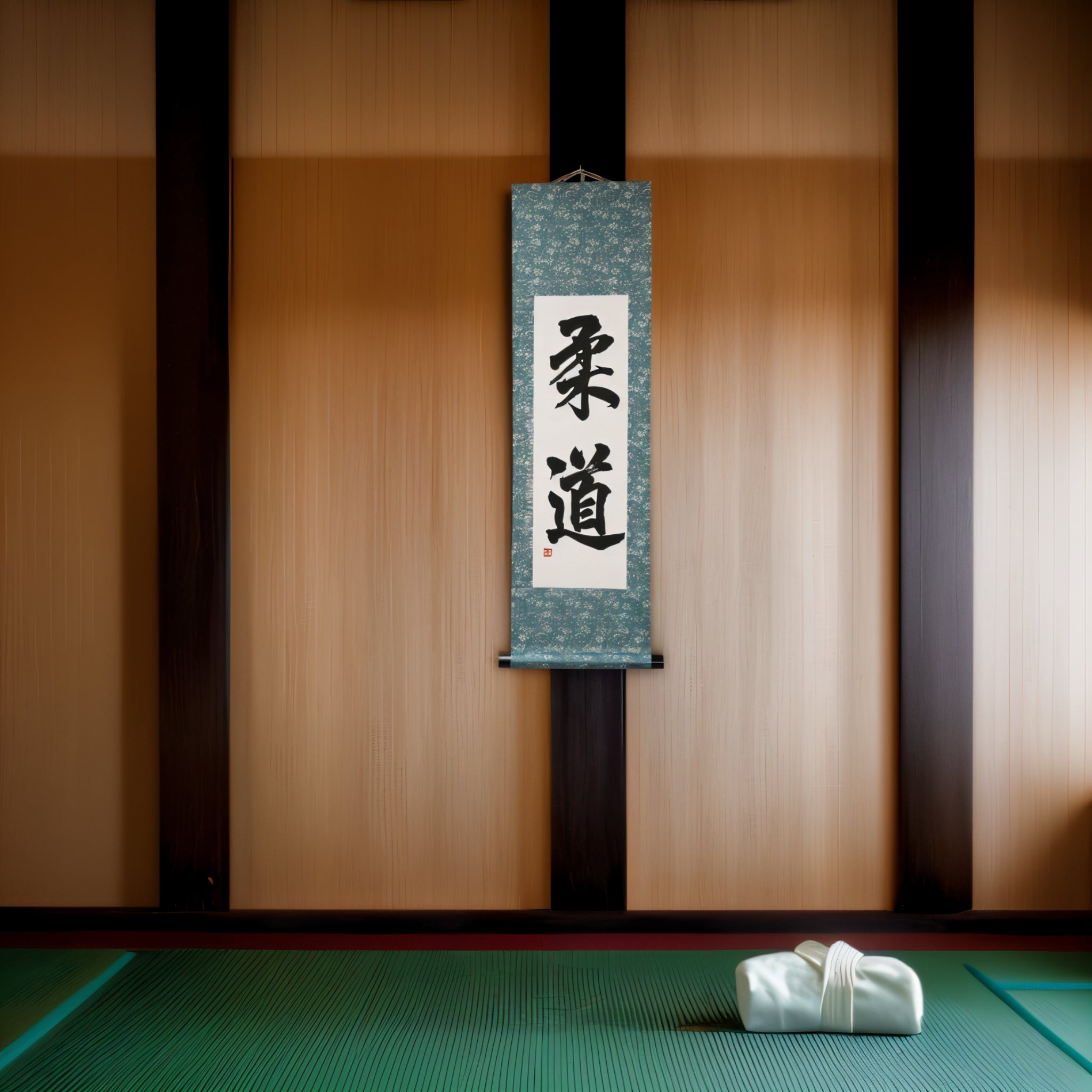 Diese Kalligraphie-Rolle zeigt die kräftigen Zeichen 柔道 (Judo), ein Wort, das weit mehr bedeutet als nur eine Kampfsportart. Judo ist sowohl eine Disziplin als auch eine Philosophie — ein Weg, den Körper zu stärken, den Geist zu beruhigen und den Charakter durch Übung zu entwickeln.