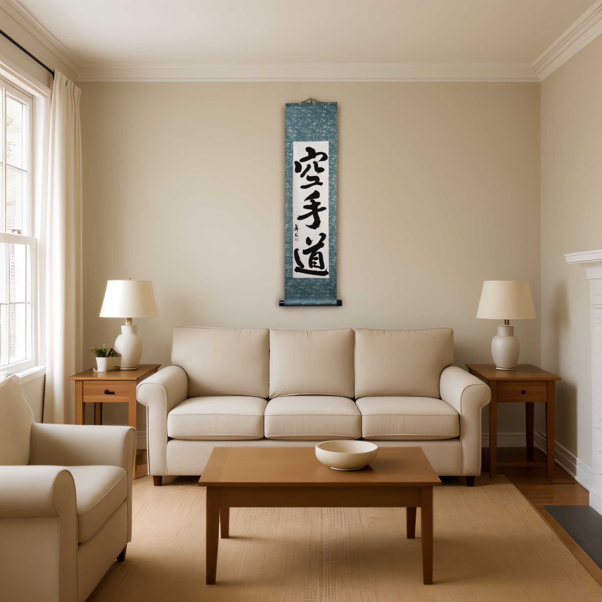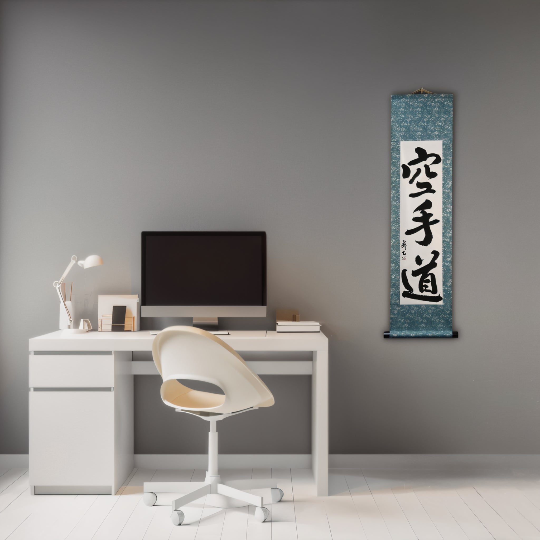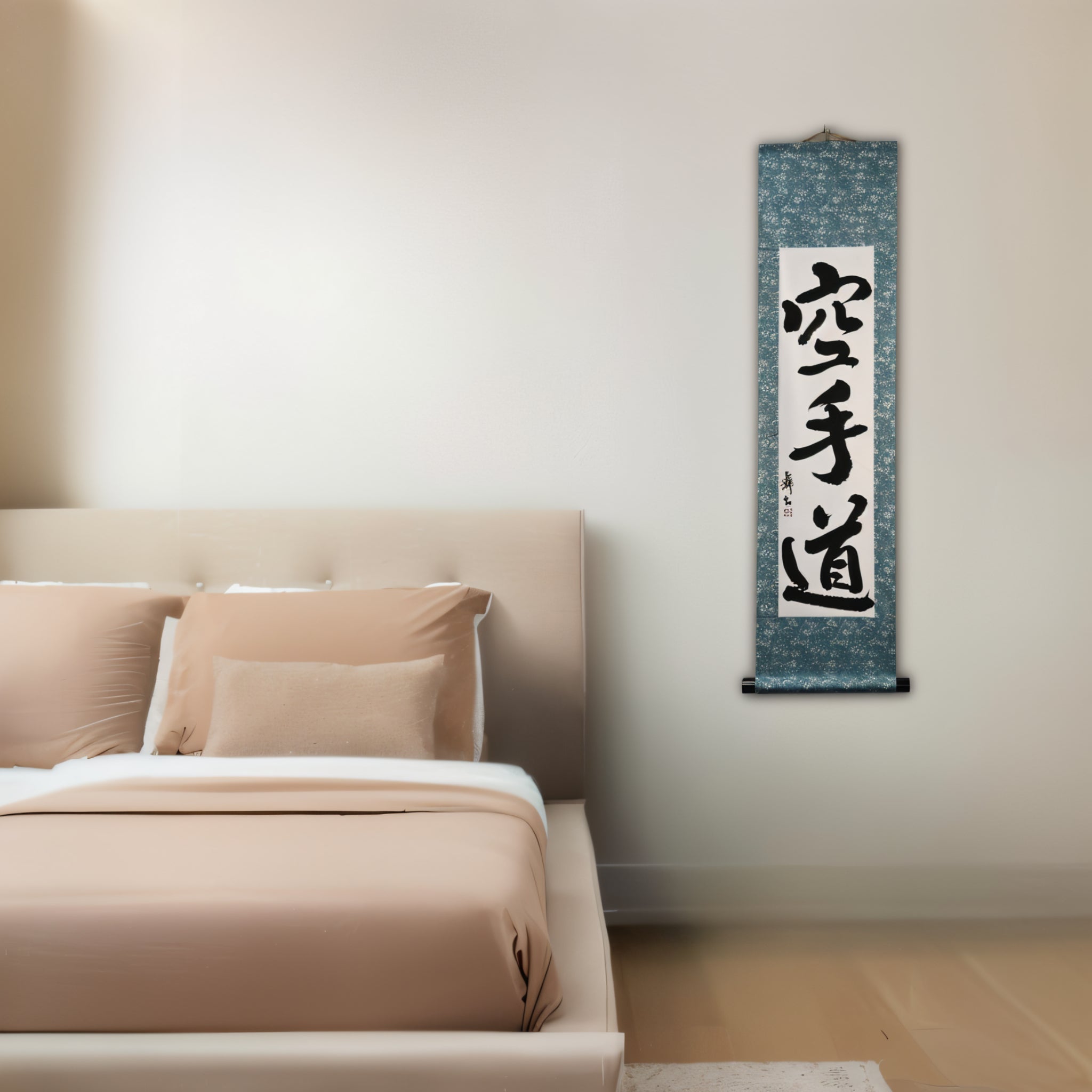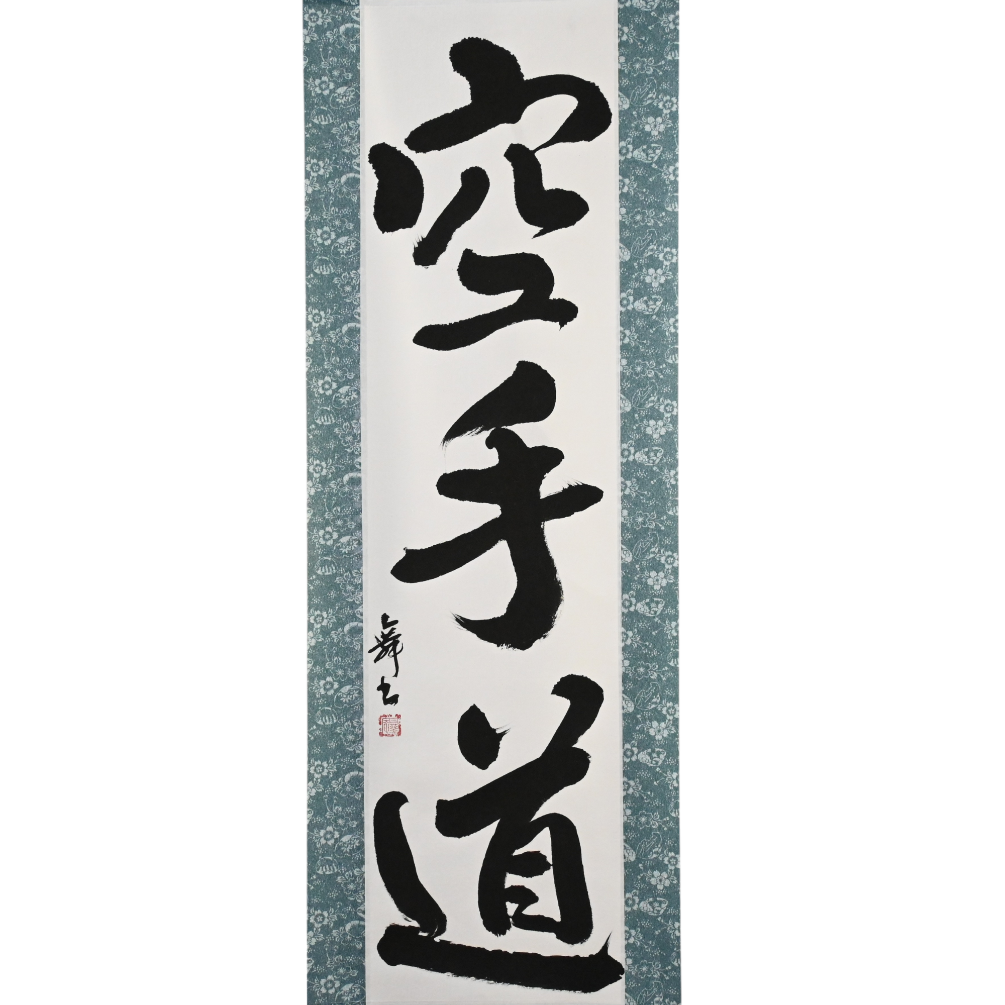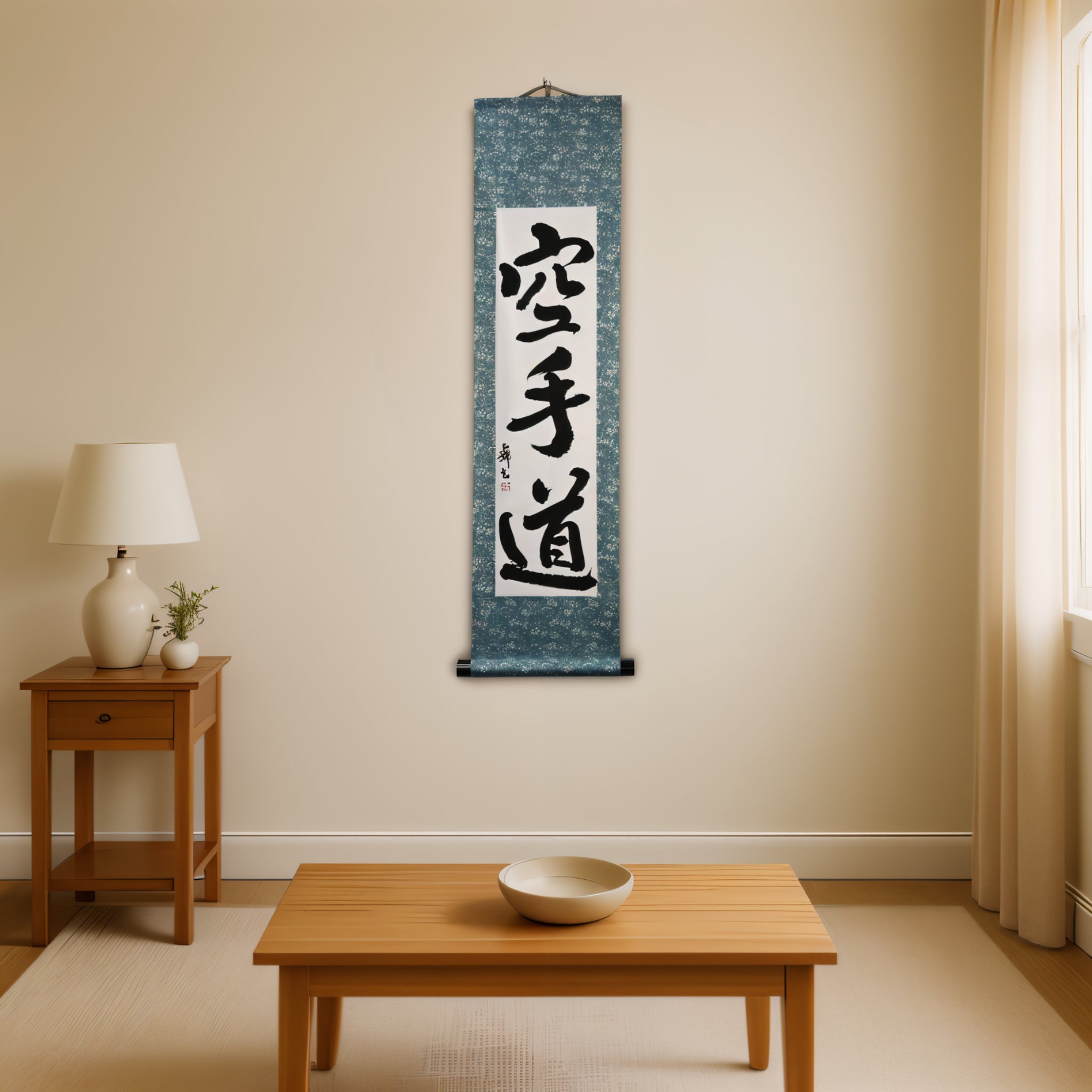 Diese Kalligraphie-Rolle zeigt den kraftvollen Ausdruck 空手道 (Karate-do) — nicht nur eine Kampfkunst, sondern eine lebenslange Reise von Disziplin, Respekt und innerer Stärke.