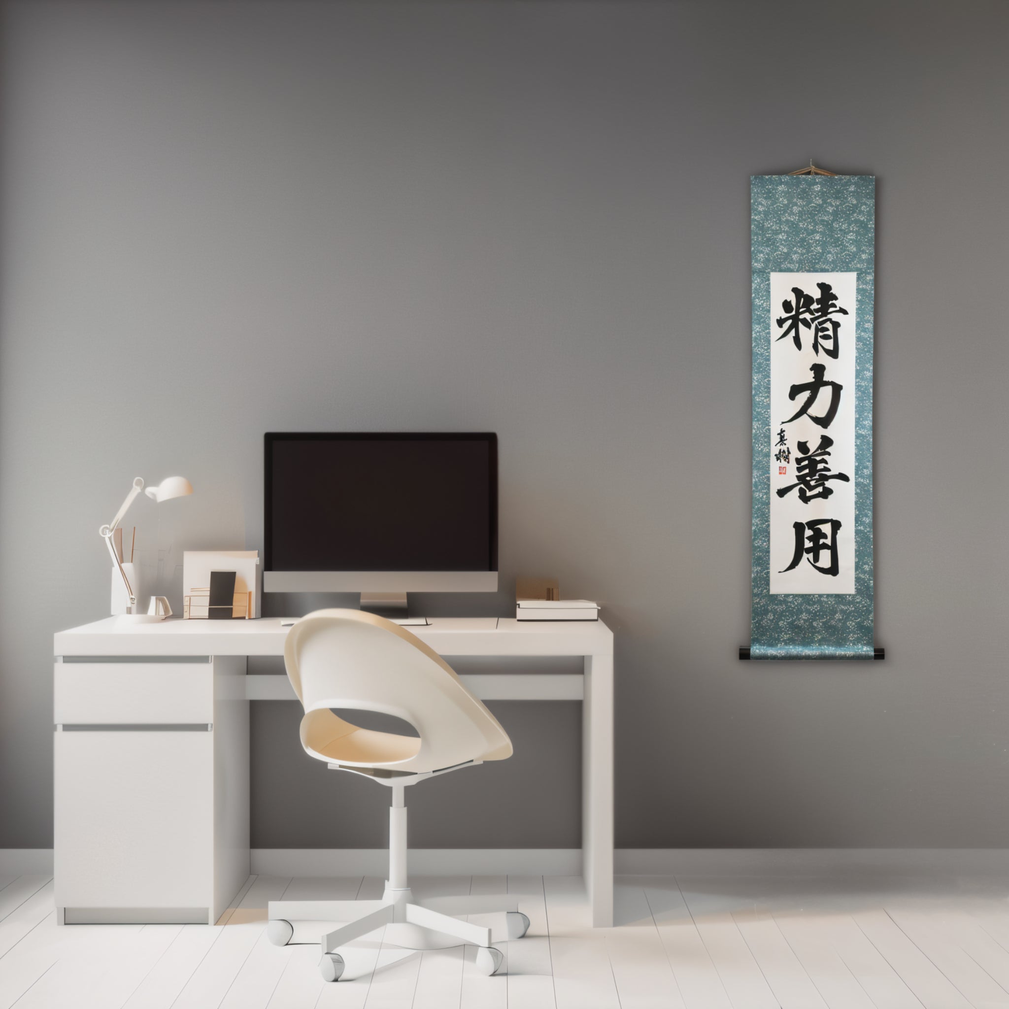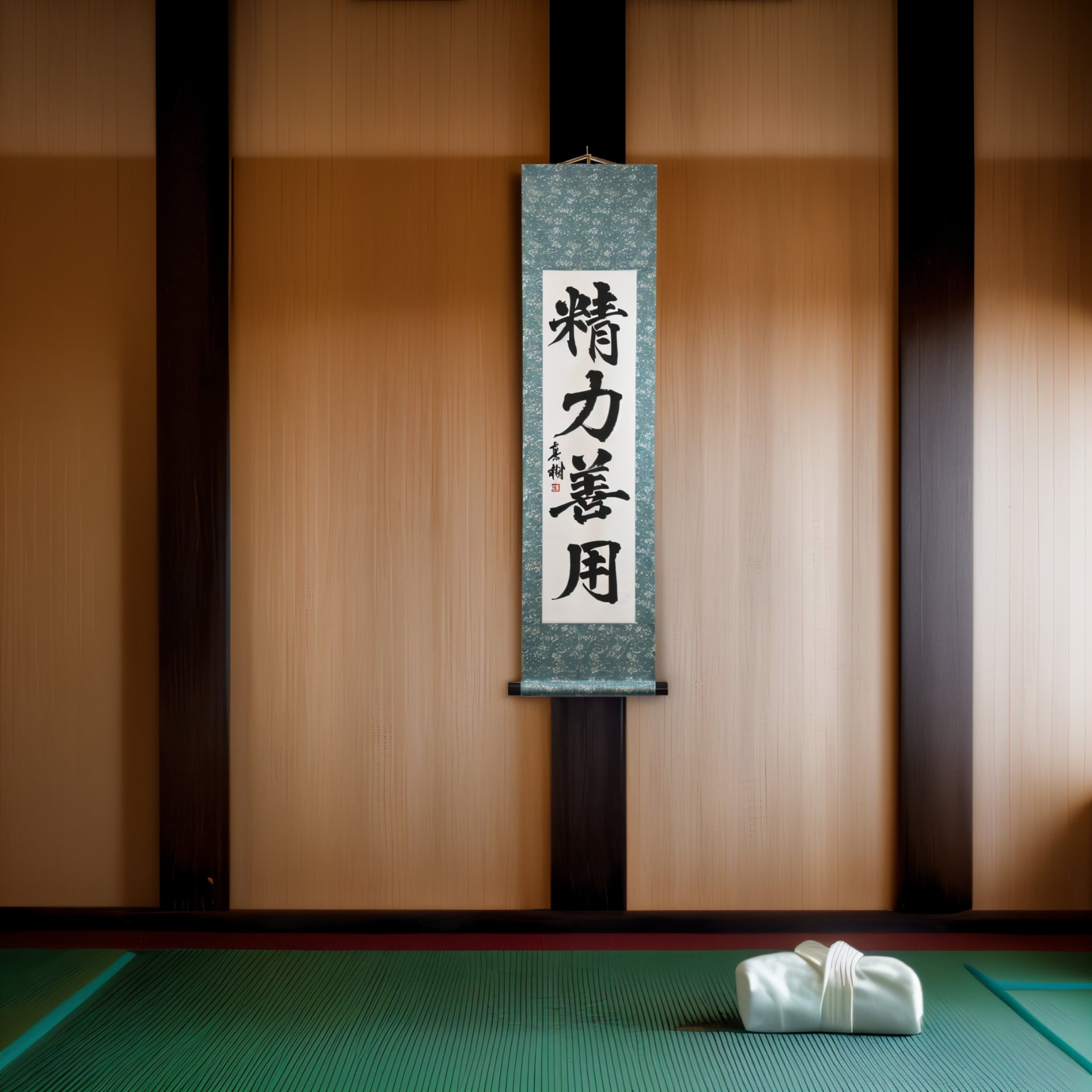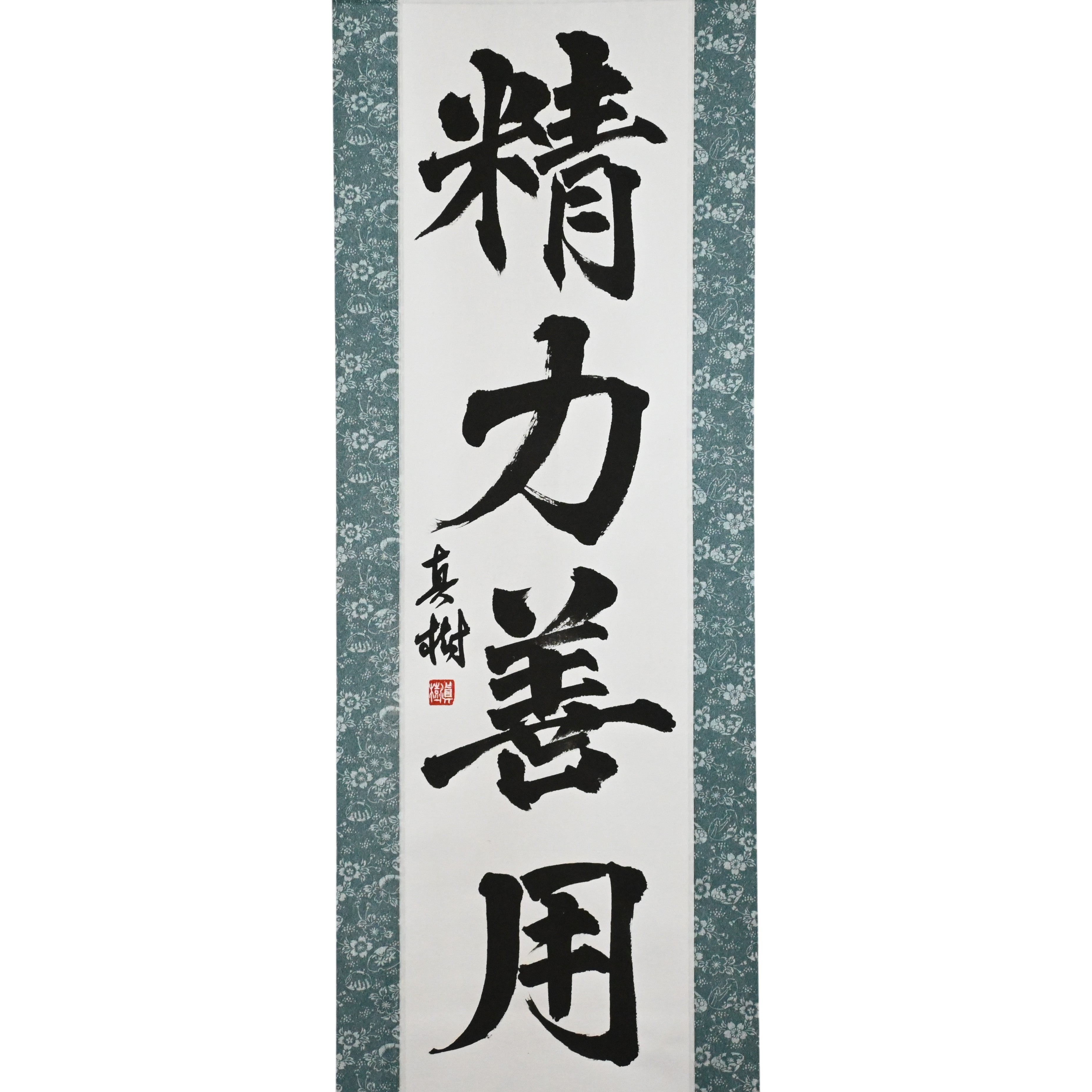 Diese japanische Kalligraphie-Rolle zeigt den zeitlosen Ausdruck 精力善用 (Seiryoku-Zenyō) — übersetzt als "Maximale effiziente Nutzung von Energie". Es ist eines der beiden Kernprinzipien des Judo, neben 自他共栄 (Jita-Kyōei, "Gegenseitiges Wohlergehen und Nutzen"), beide von Judos Gründer Jigoro Kano (嘉納治五郎) festgelegt.