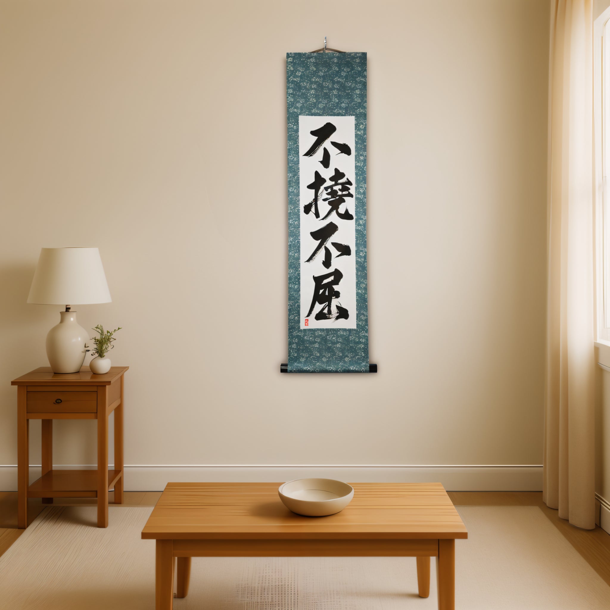 Diese japanische Kalligraphie-Rolle zeigt den kraftvollen Ausdruck 不撓不屈 (Futō Fukutsu) — ein kraftvoller Ausdruck des unbezwingbaren Geistes, der im Herzen der japanischen Kampfkunst und des Samurai-Codes liegt.